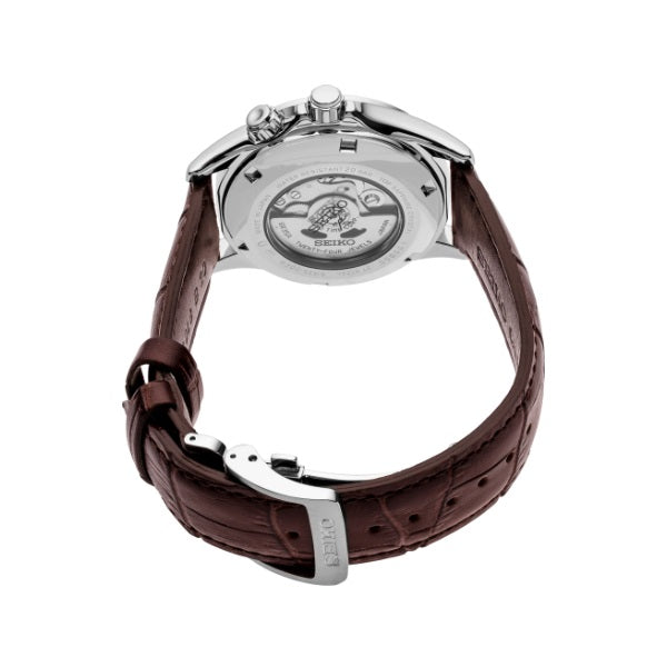 From the Prospex Collection. Designed for those who treat life as the ultimate adventure, the Seiko Prospex line follows every challenge with technological excellence and style. A modern re-imagining of Seiko's first sport watch, introduced in 1959, this distinctive timepiece is an upgrade of a highly successful Spring 2019 limited edition. Equipped with a rotating inner compass bezel for outdoor adventure, this unique design features a sunray-finish green dial with gold accents, LumiBrite hands and markers, magnified date window, and sapphire crystal with anti-reflective coating on the inner surface. The 24-jewel automatic movement beats at a frequency of 21,600 vibrations per hour, with a power reserve of approximately 70 hours, and can be wound manually or automatically. Crafted of stainless steel, with brown leather strap, secure tri-fold push button release clasp, screwdown crown and see-through caseback. 20 bar, 200M Water Resistant.